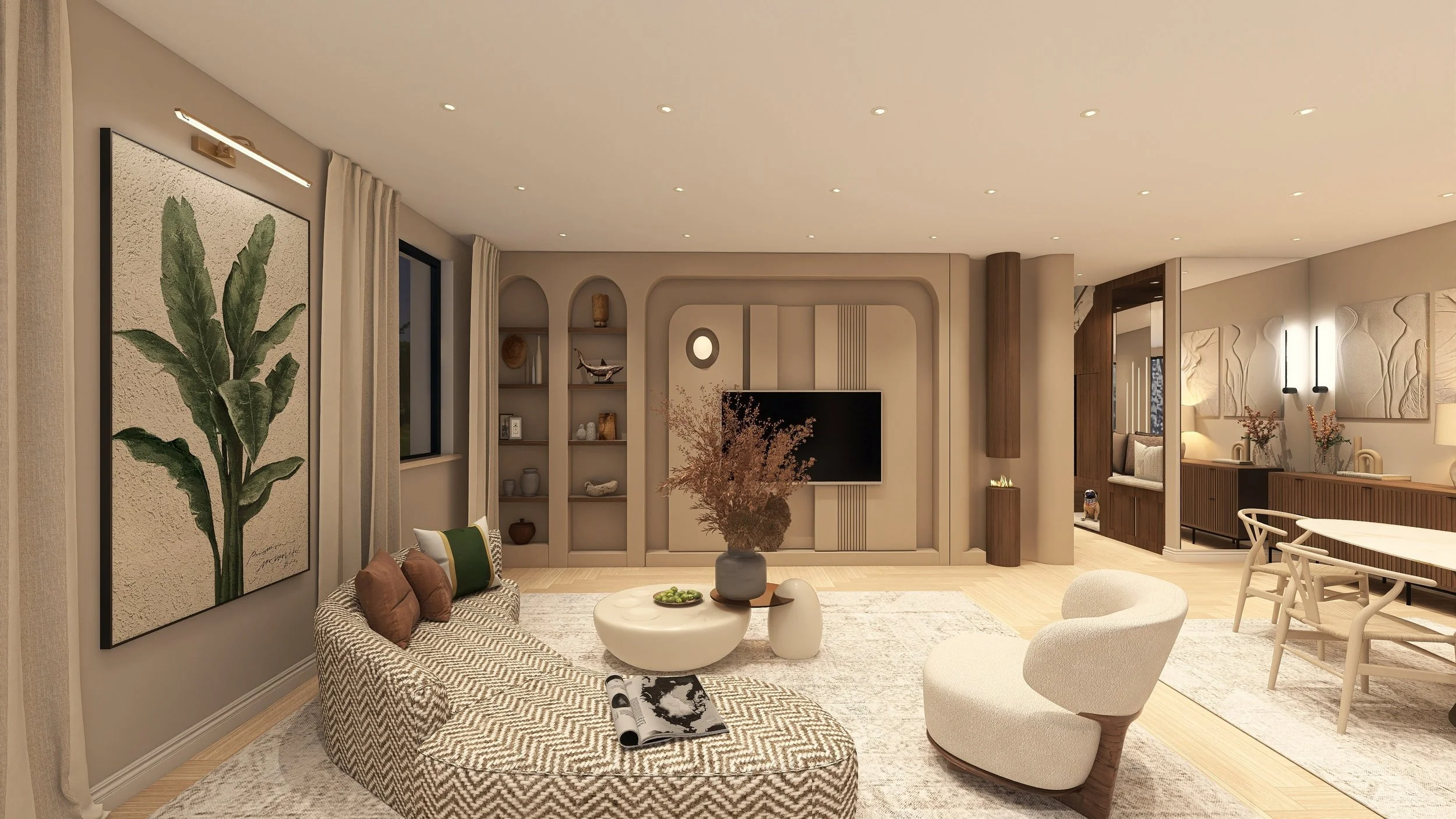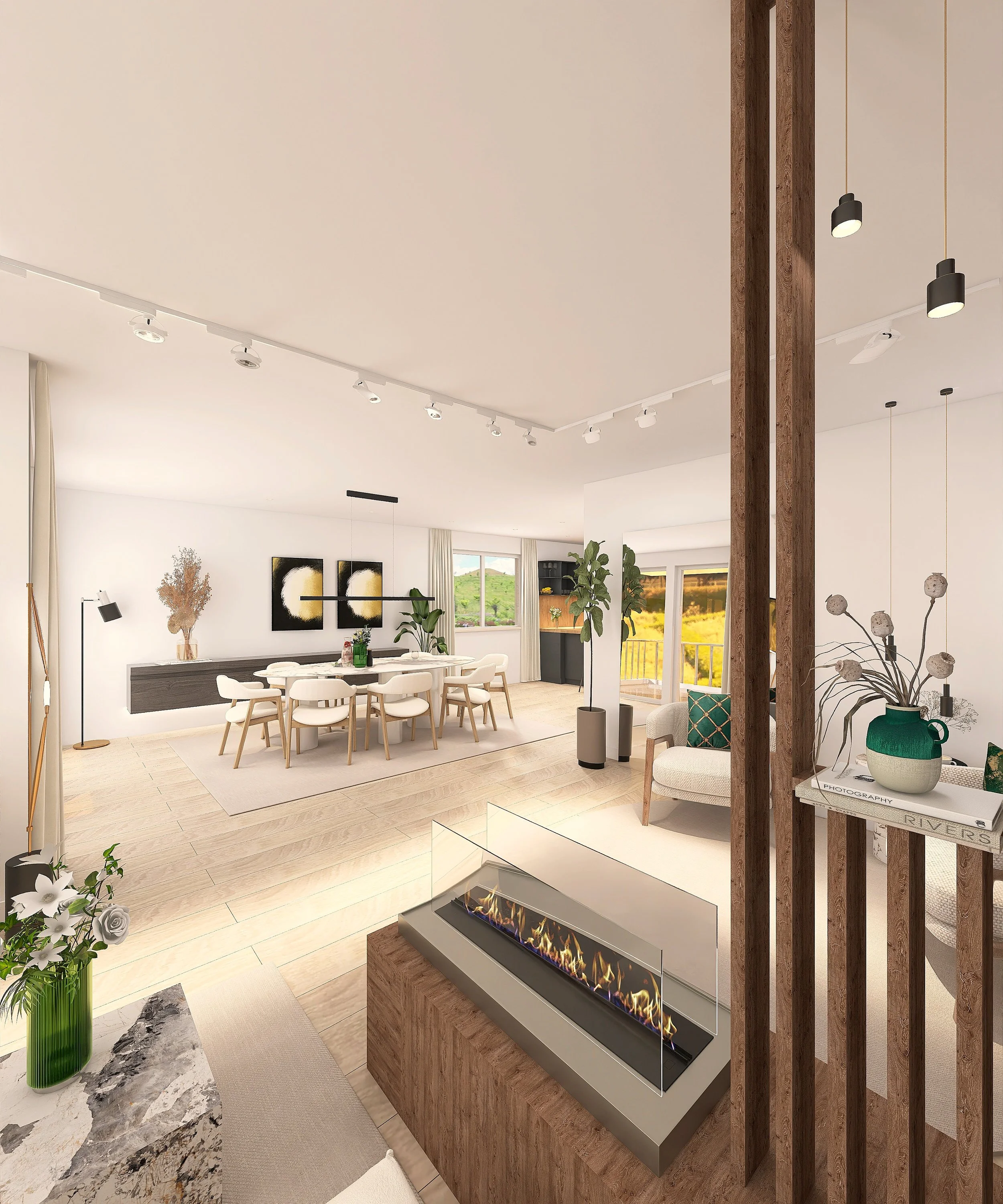 Für eine Familie mit zwei Mädchen entstand hier ein Wohn- und Essbereich, der Wärme und Ästhetik vereint. Der Wunsch der Eltern nach einem ruhigen Rückzugsort wurde in Form einer integrierten, stilvollen Leseecke umgesetzt, während der neu inszenierte Gasofen als zentrales Designelement dem Raum seinen besonderen Charakter verleiht. Am großzügigen Esstisch und im einladenden Wohnzimmer finden heute Familienzeit und gesellige Stunden mit Gästen gleichermaßen ihren Platz.